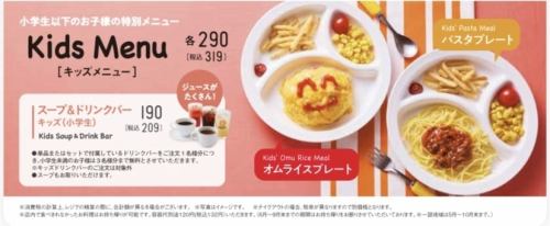 小学生以下のお子様向けのオムライスプレート・パスタプレートをご用意しています。また、小学生未満のお客様はドリンクバー無料のサービスもございます♪靴を脱いでくつろげるお席もありますのでお子様連れのお客様もお気軽にお越しください。